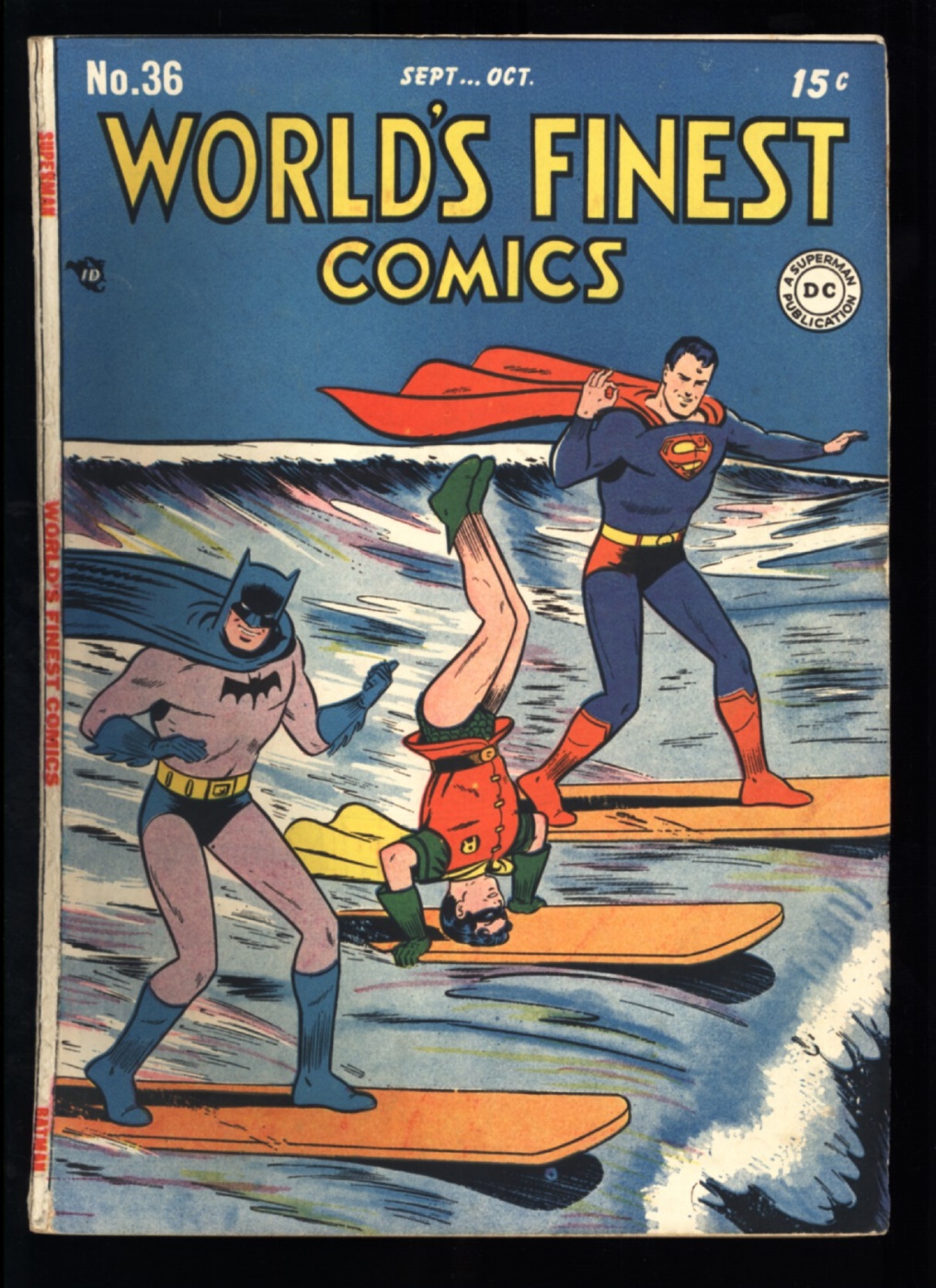 Superman, Batman, and Robin surfing cover and story